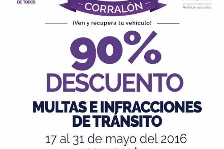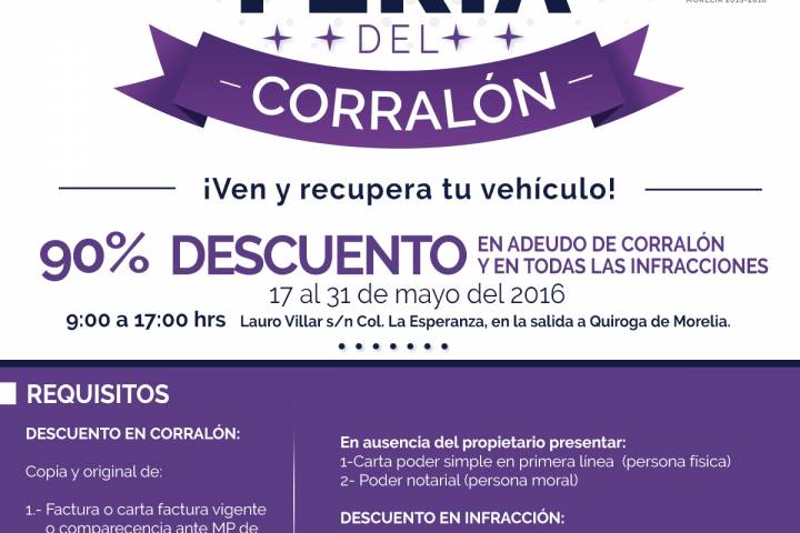 NOTICIAS 29/05/2016Este martes concluye la "Segunda Gran Feria del Corralón" Restan pocos días para que concluya el plazo de la "Segunda Gran Feria del Corralón", en la cual desde el 17 de mayo se ha aplicando el 90 por ciento de descuento sobre infracciones en general y adeudo de corralón, salvo en el caso de las multas por manejar bajo influencia del alcohol o cuando los vehículos sean materia de algún litigio. El lunes 30 y martes 31 de mayo será la última oportunidad para obtener este beneficio.