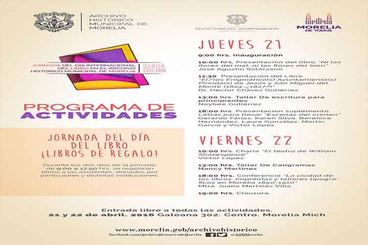 NOTICIAS 12/04/2016Invitan a donar ejemplares y participar en la Quinta Jornada del Día Internacional del Libro Con el objetivo de acercar la lectura a la población moreliana, la Secretaría del Ayuntamiento, a través del Archivo Histórico Municipal, convoca a la ciudadanía a realizar donativos de ejemplares para la Quinta Jornada del Día Internacional del Libro, evento en el cual se recaudan diversos textos donados por instituciones y particulares.