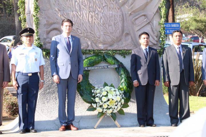 Teniendo de fondo las Estelas de la Constitución, el Alcalde, acompañado del subsecretario de Gobernación, Armando Hurtado Arévalo, el Mayor de la Fuerza Aérea Mexicana y representante de la XXI Zona Militar, José Rafael Mendoza Go... Ver más...