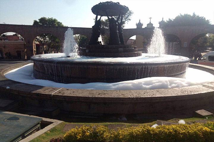 Este lunes se realizó la limpieza en la Fuente de las Tarascas, luego de que el domingo por la noche, arrojaran detergente en polvo, causando que se llenara de espuma y por consecuente se derrama hacia la avenida Madero, lo cual, además del daño a la cantera, representa un peligro para los motociclistas y vehículos, por el riesgo de que derrapen y ocasionen un accidente.