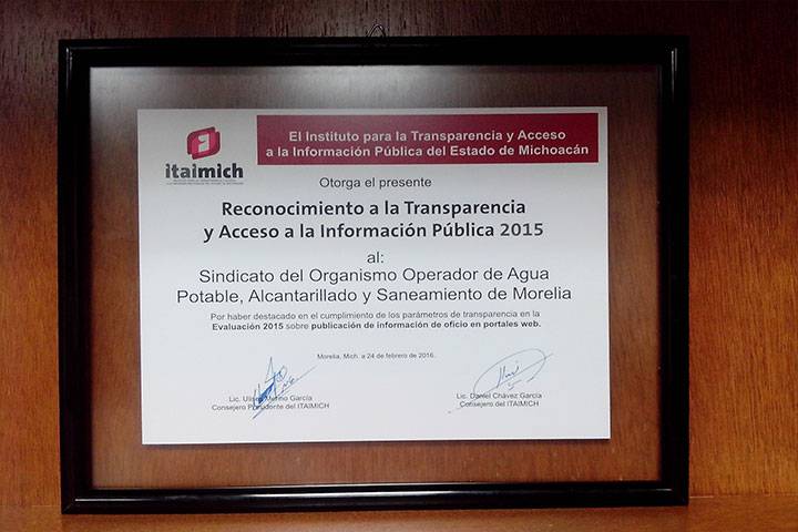El día de hoy el Instituto para la Transparencia y Acceso a la Información Pública del Estado de Michoacán (ITAIMICH) realizó la Ceremonia de entrega de reconocimientos a las entidades públicas que acreditaron la evaluación de transparencia del 2015, entre las cuales destaca el Sindicato de Trabajadores del Organismo Operador de Agua Potable, Alcantarillado y Saneamiento de Morelia (STAOOAPAS), que acreditó los parámetros con una calif... Ver más...