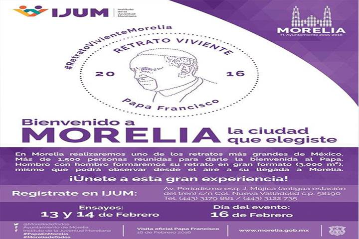 NOTICIAS 09/02/2016IJUM llama a jóvenes a participar en Retrato VivienteComo parte de las actividades que el Ayuntamiento de Morelia realizará para enmarcar la visita del Papa Francisco a la capital del estado durante el próximo 16 de Febrero, el Instituto de la Juventud Moreliana (IJUM), continúa invitando a los jóvenes para inscribirse para participar en el Retrato Viviente, así lo informó Ana Cristina Prado, directora de dicha área municipal.