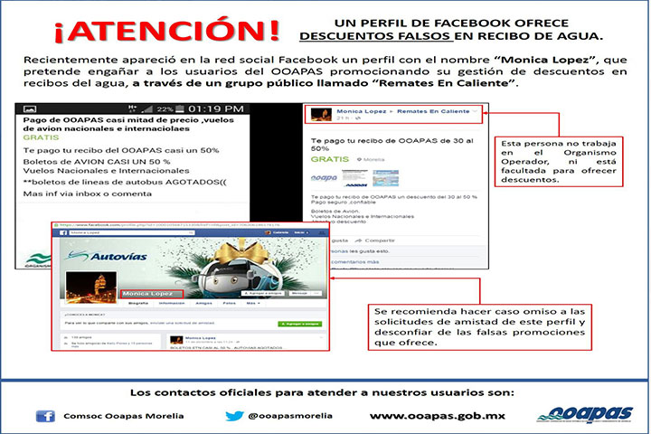 El Organismo Operador de Agua Potable, Alcantarillado y Saneamiento de Morelia (OOAPAS) informa que el día de hoy lunes se detectó un perfil en la red social Facebook, con el alias "Monica Lopez", que está ofreciendo gestionar el pago del recibo de agua con descuentos hasta de 50%.