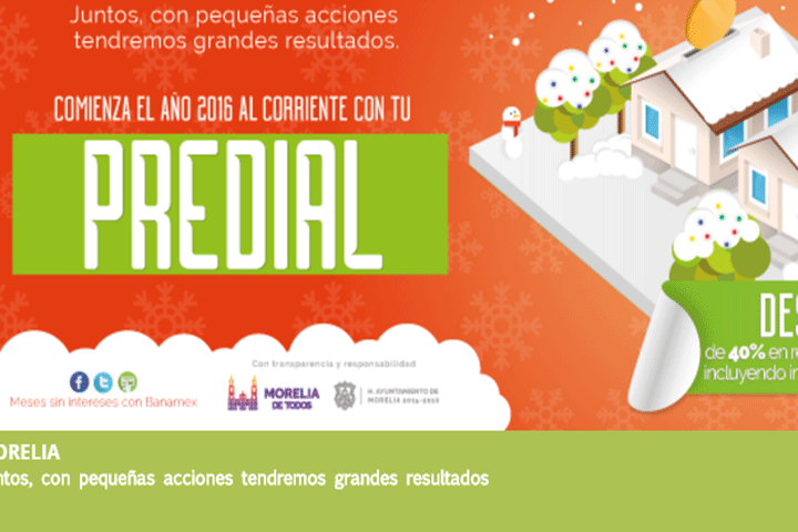 NOTICIAS 13/12/2015Mantendrán descuentos en pago de multas y recargos A un par de semanas de que concluyan los descuentos en pago de multas y recargos en impuestos municipales, el Ayuntamiento de Morelia, a través de la Tesorería municipal, llama a los ciudadanos a aprovechar su aguinaldo y ponerse al corriente con los laudos por concepto de multas e infracciones, de tal manera que inicien el 2016 sin deudas con el municipio.