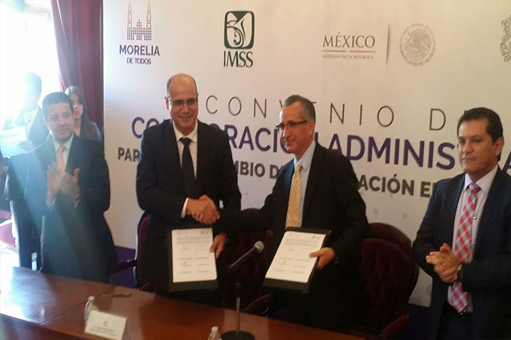 NOTICIAS 18/11/2015Ayuntamiento de Morelia firma convenio a favor de trabajadores de la construcciónCon la finalidad de incrementar la cantidad de personas con seguridad social en el municipio sobre todo para los profesionistas del ramo de la construcción, el Ayuntamiento de Morelia y la delegación michoacana del Instituto Mexicano del Seguro Social (IMSS) firmaron el Convenio de Colaboración Administrativa para el Intercambio de Información en Materia Fiscal.