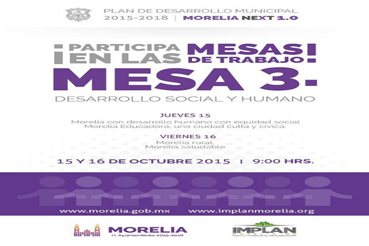 NOTICIAS 15/10/2015Se suma ciudadanía al diseño del Plan de Desarrollo Municipal de MoreliaContinúan las mesas de trabajo del Plan de Desarrollo Municipal 2015-2018, Morelia NExT 1.0 cuya temática de este jueves fue el Desarrollo Social Humano, con los subtemas, Morelia con desarrollo humano, con equidad y Morelia educadora: una ciudad culta y cívica.