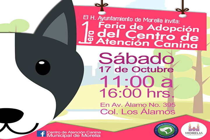 NOTICIAS 15/10/2015Realizará Centro de Control Canino de Morelia campaña de adopción La Secretaria de Servicios Públicos a través de la Dirección de Servicios Auxiliares y el Departamento de Control Canino, realizarán el próximo 17 de octubre la Feria de la Adopción la cual está programada para realizarse de las 11:00 horas hasta las 16:00 horas en las instalaciones del centro ubicadas en la avenida Álamo No. 395 colonia Álamo.