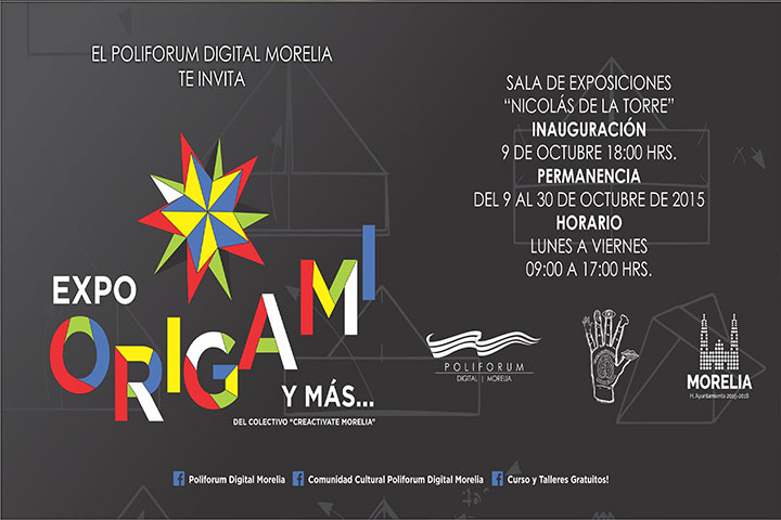 NOTICIAS 10/10/2015Inauguran "Expo ORIGAMI y más?" en Poliforum Digital MoreliaEl Poliforum Digital Morelia, dio inicio a la "Expo Origami y más?", donde participan 12 artistas con trayectoria y jóvenes creadores del Estado así como de la Ciudad de México, exponiendo técnicas como el origami, "pache", pintura, entre otras.