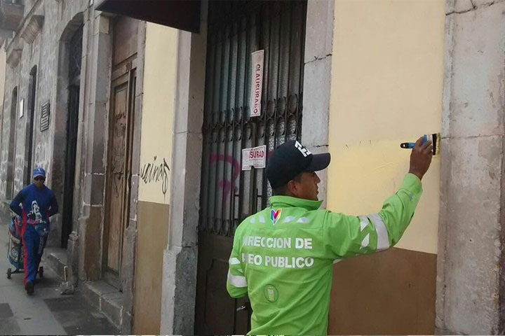 NOTICIAS 13/09/2015El Ayuntamiento de Morelia borra graffitis en edificios históricosCon la finalidad de conservar la buena imagen urbana del Centro Histórico, la Dirección de Aseo Público Municipal de la administración encabezada por el presidente Alfonso Martínez Alcázar comenzó con la limpia de graffitis pintados en las fachadas de diversas edificios históricos, así como de inmuebles particulares que se ubican cerca o en el primer cuadro de la ciudad.