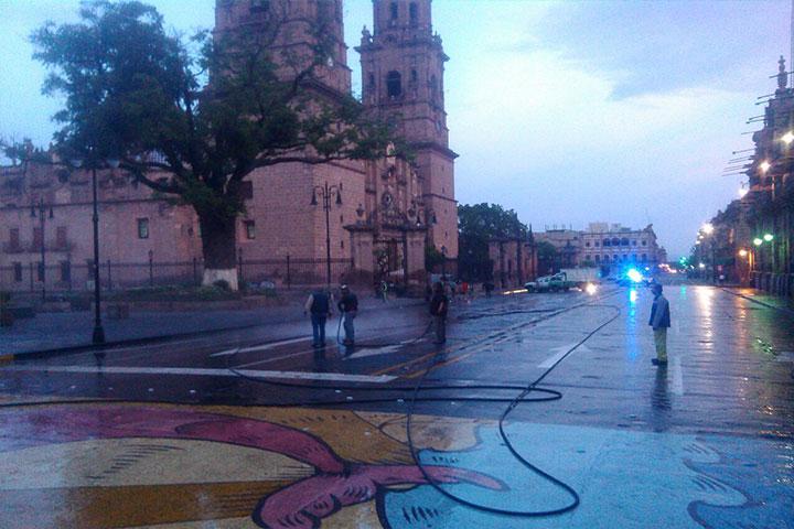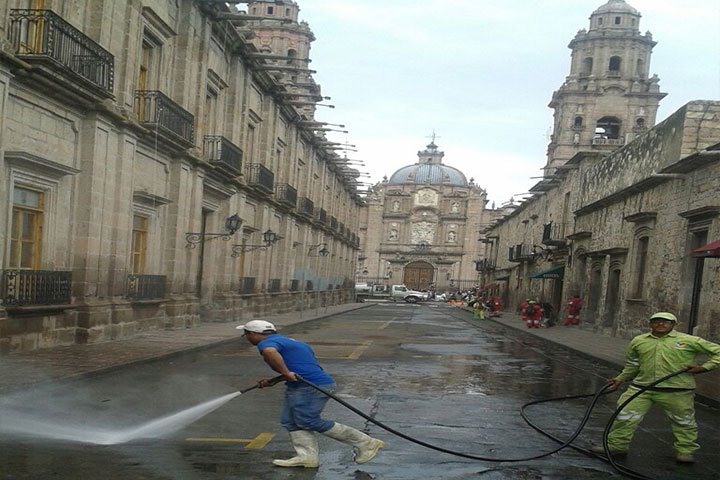 Trabajadores de la Dirección de Aseo Público del Ayuntamiento de Morelia realizaron la limpieza integral de la calle Benito Juárez, en el Centro Histórico de la ciudad, luego de que fue retirado el plantón que se mantuvo durante más de un mes a un costado de Palacio de Gobierno.