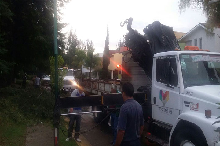 Elementos de Protección Civil y Bomberos de Morelia, así como personal de la Dirección de Parques y Jardines del Ayuntamiento capitalino, acudieron al fraccionamiento Campestre Las Huertas a atender el llamado de los vecinos, quienes reportaron la caída de una decena de árboles de entre diez y quince metros de alto, como consecuencia de la tormenta de este domingo.