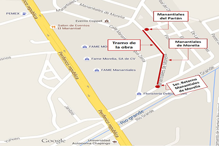 La lÃnea del colector quedará ubicada en el tramo que comprende de la calle Manantial del Parián hasta la calle de la Higuera (o Primer Retorno de Manantiales de Morelia).