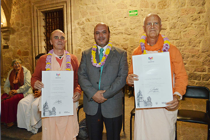 NOTICIAS 03/01/2015Reconoce ayuntamiento de Morelia a visitantes distinguidos de la IndiaA nombre del Ayuntamiento moreliano, el Director de Turismo Carlos García Delgado entregó reconocimientos como visitantes distinguidos al líder mundial de la iglesia Sri Chailanya Saraswat Sera Ashram, Sripad Bhkti RanJan y al Presidente de la misma en México, Sripad Bhakti Kusum.