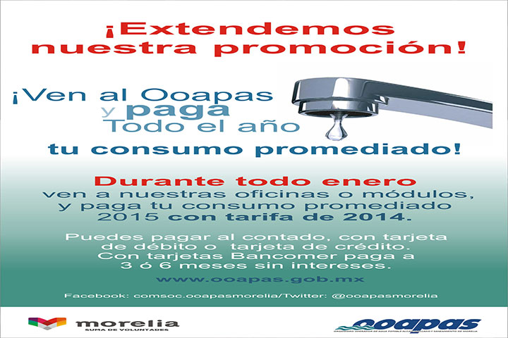 NOTICIAS 05/01/2015OOAPAS extiende promoción de Pago AnticipadoEl Organismo Operador de Agua Potable, Alcantarillado y Saneamiento de Morelia (OOAPAS) extiende su Programa de Pago Anticipado durante todo el mes de enero, donde los usuarios podrán pagar el 2015 basándose en el promedio de sus consumos de agua con las tarifas vigentes de 2014.