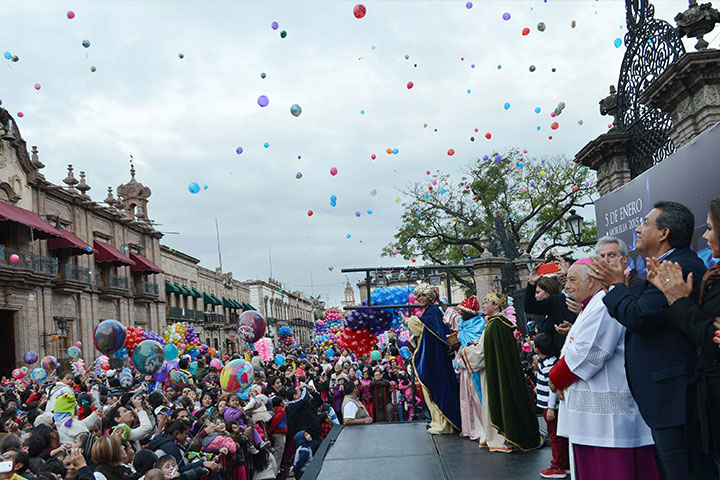 NOTICIAS 05/01/2015Melchor, Gaspar y Baltazar llegan a MoreliaAl dar la bienvenida a los Reyes Magos que visitarán esta noche los hogares de los miles de niños morelianos, el presidente municipal Wilfrido Lázaro Medina, acompañado por su esposa la Sra. Maggy Oribio de Lázaro y el Cardenal Don Alberto Suárez Inda, les pidió a Melchor, Gaspar y Baltazar ser los portadores de un mensaje de paz, reconciliación y salud.