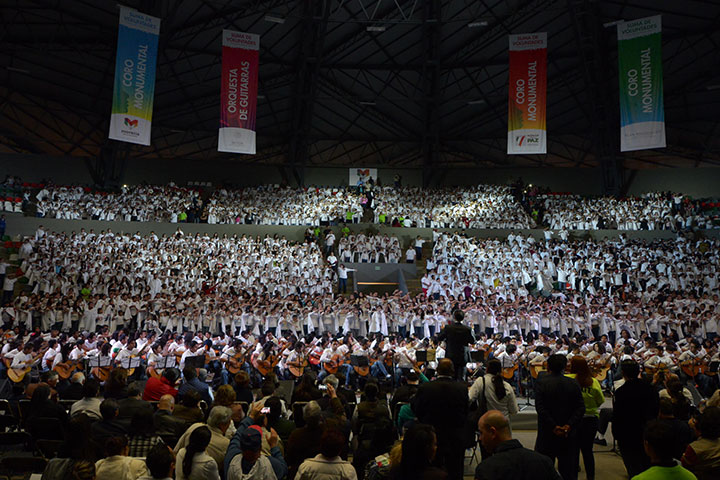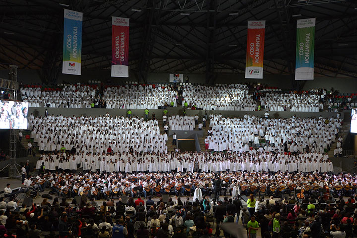 NOTICIAS 18/12/2014Niños y jóvenes morelianos promueven la paz con su cantoLas voces de más de tres mil niños y jóvenes morelianos inundaron el auditorio del complejo deportivo Bicentenario, cumpliendo con ello el compromiso del presidente Wilfrido Lázaro Medina de respaldar a las familias de 77 colonias del municipio para que sus hijos, unidos por la música, lleven un mensaje de paz a sus hogares, apoyados por la Suma de Voluntades de los gobiernos federal y estatal.