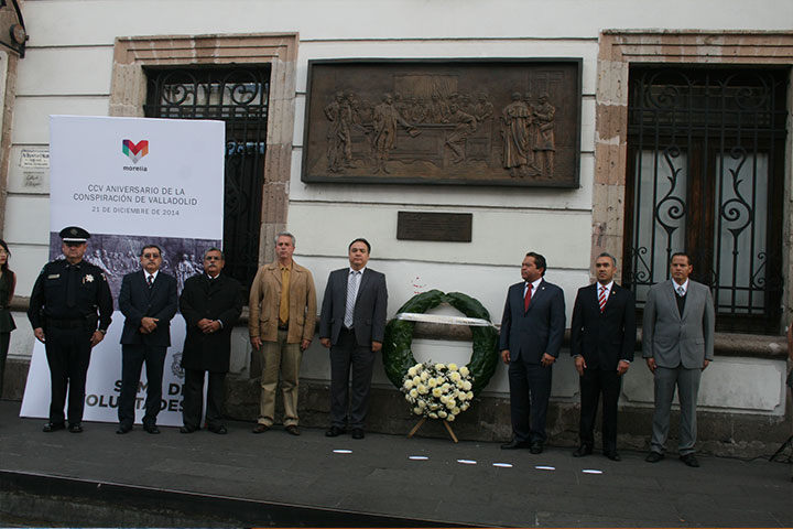 NOTICIAS 21/12/2014Conmemora CCV aniversario de la Conspiración de ValladolidEn conmemoración del CCV aniversario del descubrimiento de la Conspiración de Valladolid, hoy Morelia, este domingo el Ayuntamiento que preside Wilfrido Lázaro Medina realizó una guardia de honor y el depósito de una ofrenda floral, que encabezó el secretario Arturo José Mauricio Fuentes, en representación del alcalde moreliano.