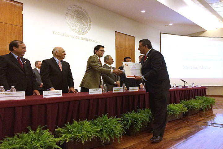 NOTICIAS 14/12/2014Recibe Morelia otro reconocimiento como ciudad patrimonioLa Cámara de Diputados entregó a Morelia un reconocimiento en el marco del aniversario número 23 de la Declaratoria como Ciudad Patrimonio de la Humanidad. Este reconocimiento fue entregado en la ciudad de Oaxaca, por José Javier Villicaña, presidente municipal de dicha ciudad.