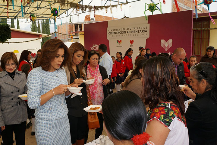 NOTICIAS 11/12/2014Concluye el 4º Taller de Orientación Alimentaria Con la capacitación de 199 personas en la preparación de 60 platillos, concluyó el 4º Taller de Orientación Alimentaria del Comité para el Desarrollo Integral de la Familia (DIF) de Morelia, que fue clausurado este jueves por la presidenta de la dependencia, Margarita Oribio de Lázaro, en la Escuela Primaria Federal "Patria", en la colonia Valerio.