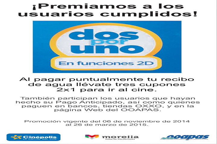 NOTICIAS 07/11/2014OOAPAS premia a los usuarios cumplidosComprometido con el proyecto del presidente Wilfrido Lázaro Medina, de sumar voluntades en favor de la sociedad moreliana, el Organismo Operador de Agua Potable, Alcantarillado y Saneamiento de Morelia (OOAPAS) arranca una edición más de la campaña "Premio al Usuario Cumplido", promoción que se realiza con el apoyo de la empresa Cinépolis y que estará vigente a partir del presente mes y hasta agotar existencias.