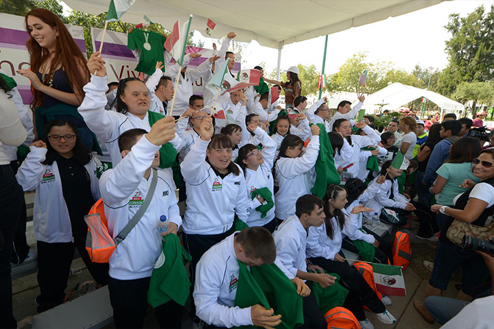 NOTICIAS 07/11/2014Izan bandera nacional en la Plaza de la HermandadCon el compromiso de cubrir de oro a México colocándolo en los primeros sitios del 7º Campeonato Mundial de Natación para Personas Con Síndrome de Down, la delegación mexicana de jóvenes que competirán en esta justa izó la bandera nacional en el asta central de la Plaza de la Hermandad, ubicada en el Complejo Deportivo Indeco, de esta ciudad capital.