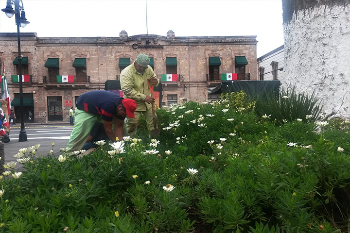 NOTICIAS 11/09/2014Embellecen el centro de Morelia para las fiestas patriasEn el marco de las fiestas patrias y con el objetivo de embellecer los espacios que frecuentan morelianos y turistas que visitan la ciudad de la cantera rosa, el Ayuntamiento realiza el cambio de plantas en los principales jardines del Centro Histórico, en donde se diseñaron Banderas Nacionales alusivas a los festejos por el inicio de la gesta de Independencia y el Natalicio de José María Morelos y Pavón.
