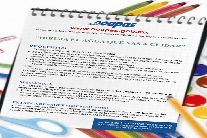 NOTICIAS 06/08/2014OOAPAS lanza promoción para el regreso a clasesComprometido con el proyecto del presidente municipal Wilfrido Lázaro Medina de sumar voluntades en favor de la sociedad moreliana, el Organismo Operador de Agua Potable, Alcantarillado y Saneamiento (OOAPAS) lanza la promoción "DIBUJA EL AGUA QUE VAS A CUIDAR", dirigido a las niñas y niños de los usuarios cumplidos, que están por iniciar un nuevo ciclo escolar.