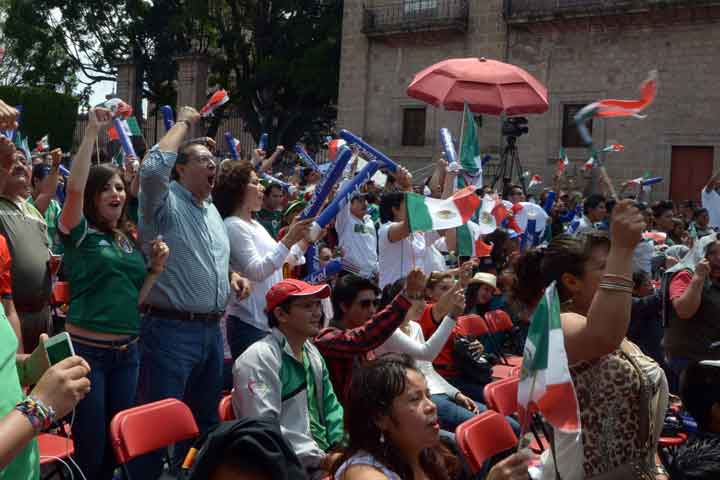 NOTICIAS 29/06/2014Disfrutan del partido en la Plaza JuárezCientos de morelianos vivieron esta tarde la pasión del futbol en la plaza Benito Juárez donde el Ayuntamiento a cargo de Wilfrido Lázaro Medina, instaló una pantalla gigante para que las familias pudieran disfrutar del partido México-Holanda en el marco de los octavos de final del Mundial de Futbol de Brasil.
