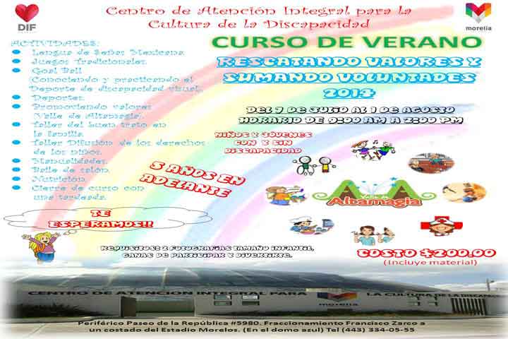 NOTICIAS 30/06/2014DIF Morelia invita a su curso de veranoEl Ayuntamiento de Morelia, a través del Comité para el Desarrollo Integral de la Familia (DIF Municipal), invita a los niños de 5 años en adelante y jóvenes a participar en el Curso de Verano "Rescatando Valores y Sumando Voluntades 2014" del Centro de Atención Integral para la Cultura de la Discapacidad, que se realizará del 07 de julio al 01 de agosto.