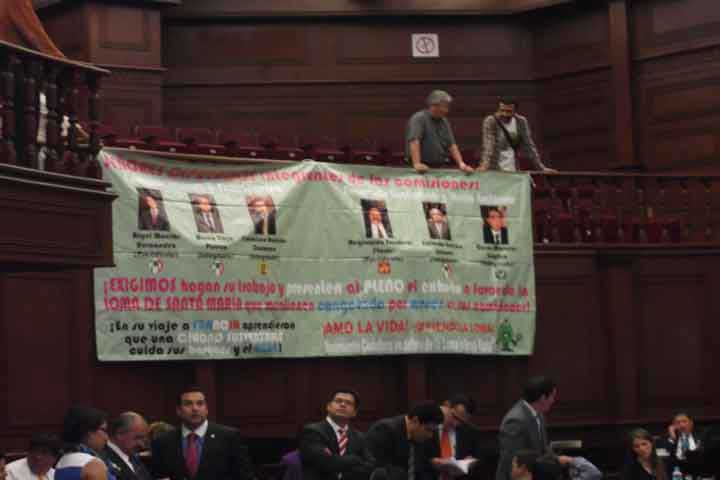 La sesión de pleno en el Congreso local comenzó con diversas manifestaciones pacíficas que desde la entrada al recinto colgaron pancartas de protesta por los viajes de diputados a Francia y Brasil, encabezada por el académico universitario, el doctor Francisco del Toro Lugo.