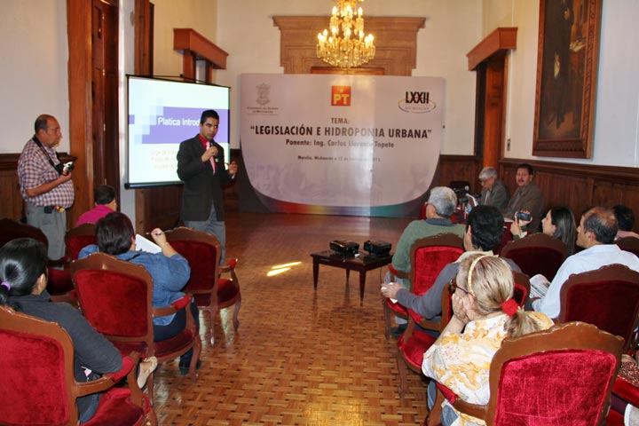 "La Ciudad de Morelia tiene condiciones climáticas ideales para la creación de azoteas verdes o huertos hidropónicos, por lo que es importante su promoción" comentó el diputado Reginaldo Sandoval Flores, presidente de la Comisión de Desarrollo Sustentable y Medio Ambiente, durante la presentación de la conferencia Legislación e Hidroponía Urbana, ofrecida por el Ing. Carlos Llorente Topete, en el Congreso del Estado.