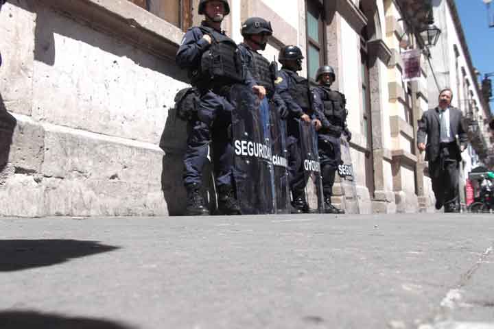 Ante la supuesta amenaza de la llegada de integrantes del grupo denominado 132 al Congreso del Estado para impedir la aprobación de recursos para el CRIT, alrededor de 70 elementos del grupo antimotines de la Secretaria de Seguridad Pública arribaron al lugar para resguardar el recinto y evitar cualquier disturbio.