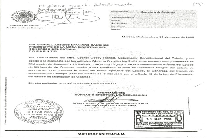 NOTICIAS  24/04/2012Fausto Miente, anterior administración entregó Plan de Desarrollo  Integral del Estado en tiempo y forma: FCTEn relación con las declaraciones del Gobernador Fausto Vallejo Figueroa, en el sentido de que la anterior administración tardó un año en presentar el Plan de Desarrollo Integral del Estado de Michoacán, Fidel Calderón Torreblanca, presidente de la Junta de Coordinación Política del Congreso del Estado, aclaró que en honor a la verdad ese Plan se entregó al Congreso del Estado el 31 de  Marzo de 2008, como lo comprueba el documento de a... Ver más...