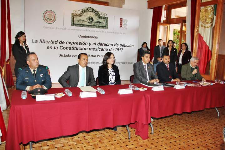 NOTICIAS 17/11/2016Libertad de expresión y petición, derechos consolidados en Constitución de 1917: Pérez Pintor Los derechos de libertad de expresión y petición se ratificaron en la Constitución de 1917, lo cual es un logro que no se hayan reformado y conservado su esencia original debido a su impecable redacción que cobra vigencia hasta nuestros días, señaló Héctor Pérez Pintor, Secretario Auxiliar dela Universidad Michoacana de San Nicolás de Hidalgo, en el marco de los festejos del Centenario de la Constitución de 1917, realizados por el Cong... Ver más...