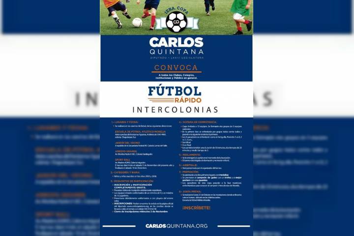 Con el propósito de fomentar una sana convivencia entre los morelianos de las próximas generaciones, el diputado moreliano del Partido Acción Nacional (PAN) Carlos Quintana Martínez anunció el arranque de la "1era. Copa de Fútbol Rápido Intercolonias Carlos Quintana" en la capital del estado.