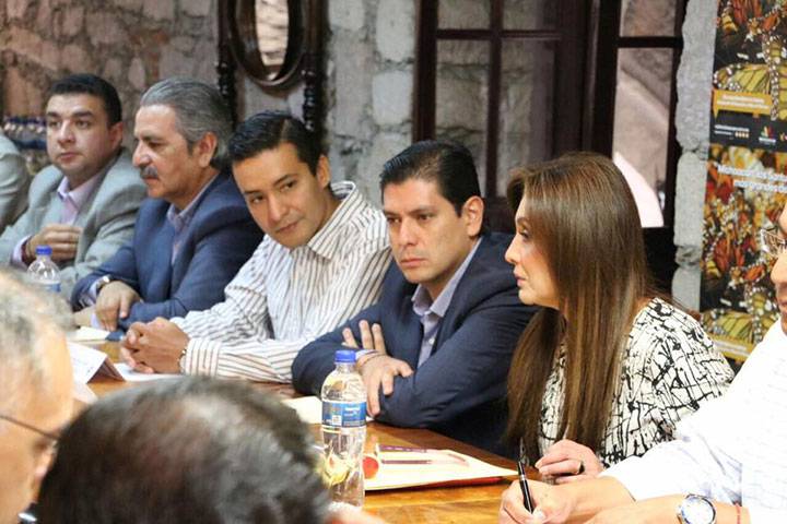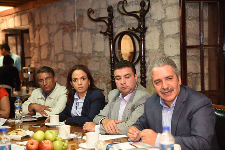 Ernesto Núñez Aguilar, coordinador del grupo parlamentario del Partido Verde Ecologista de México (PVEM) en el Congreso local y 15 representantes de las diferentes cámaras empresariales del estado se reunieron por la mañana para analizar su iniciativa de ley sobre la regulación de marchas y plantones en Michoacán.