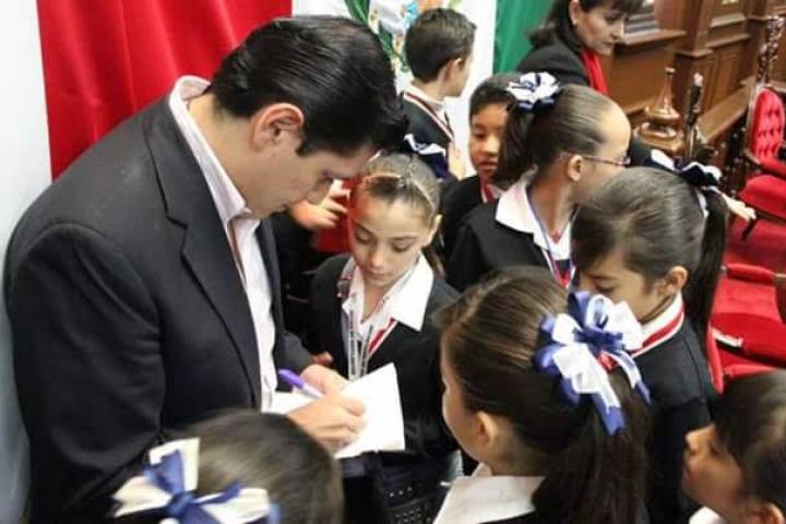 Estudiantes de primaria del Colegio José María Casares asistieron al Congreso del Estado para platicar con el diputado local del Partido Verde Ecologista de México (PVEM), Ernesto Núñez Aguilar sobre las diferentes actividades que corresponden al Legislativo y a la participación de sus integrantes.