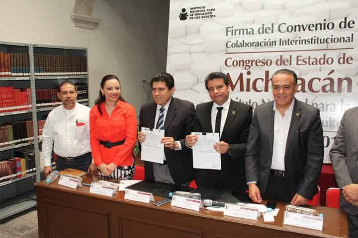 NOTICIAS 14/04/2016Congreso firma convenio con INEAEl Poder Legislativo firmó el Convenio de Colaboración con el Instituto Nacional para la Educación de los Adultos INEA, con el fin de continuar sumando esfuerzos y recursos para difundir, promover y favorecer el acceso a los servicios de alfabetización, educación primaria y secundaria en beneficio de las personas mayores de quince años en rezago educativo, dentro del circulo de estudio instalado en la biblioteca del Congreso del Estado.
