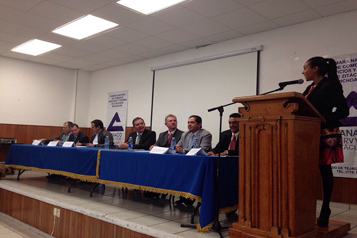 La delegada de la Secretaría de Economía en Michoacán, Diana Gabriela Hernández Lomelí, asistió como invitada especial a la toma de protesta de Raúl Cova Jalili, como presidente de la mesa directiva de la Cámara Nacional de Comercio, Servicios y Turismo (Canaco) de Zitácuaro, período 2014-2015.