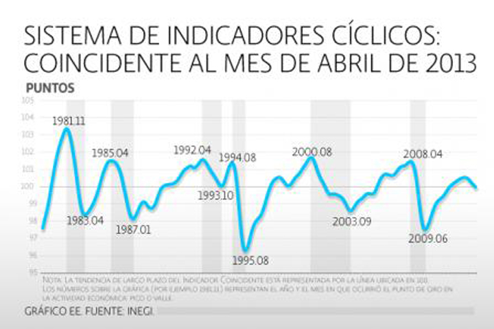 NOTICIAS 04/07/2013Economía mexicana bajó 0.07% en abril: INEGIEn abril de este año, el Indicador Coincidente siguió en desaceleración, mientras que el Indicador Adelantado continuó mostrando señales de crecimiento alrededor de la tendencia, informó el Instituto Nacional de Estadística y Geografía (INEGI).