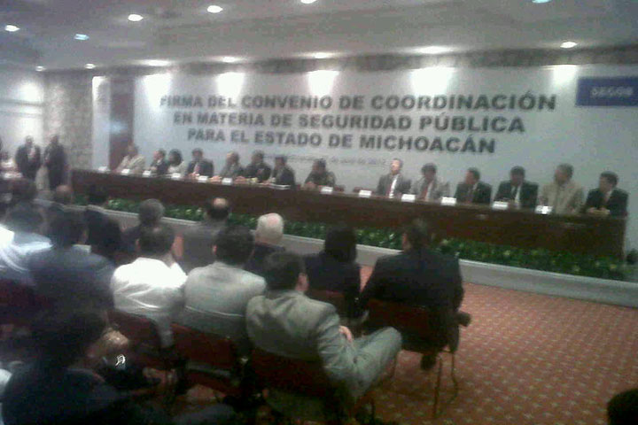 NOTICIAS 27/04/2012Federación y estado firman convenio de seguridad; ejercerá Michoacán 520 mdp en la materia"Existe una nueva etapa, existe en efecto un nuevo clima de colaboración de responsabilidad compartida. Desde el principio de la administración del presidente Calderón ha habido un esfuerzo permanente y sistemático por atender los distintos retos del estado de Michoacán. Hoy afortunadamente contamos con la voluntad y el respaldo del gobierno de Fausto Vallejo para seguir adelante y lograr estos objetivos", señalo el secretario de gobernaci... Ver más...