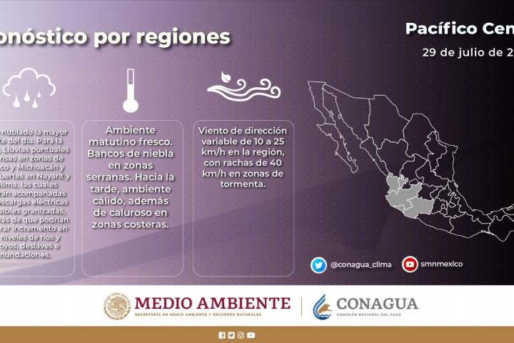 De acuerdo con el pronóstico del Servicio Meteorológico Nacional, para este fin de semana se esperan en Michoacán, lluvias muy fuertes con puntuales intensas, 75 a 150 mm, acompañadas de descargas eléctricas, vientos fuertes y condiciones para la ca... Ver más...