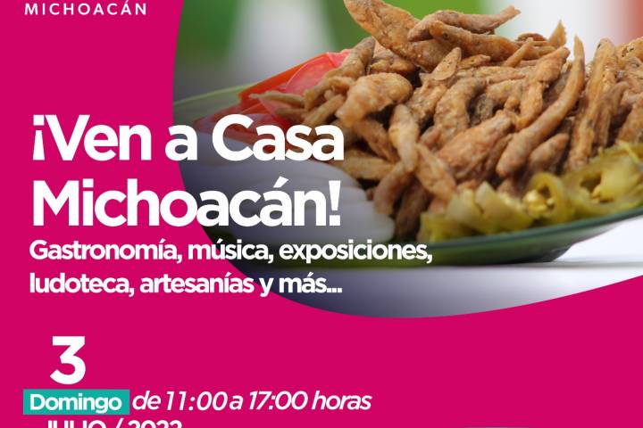 NOTICIAS 29/06/2022Este domingo, ¡Ven a Casa Michoacán!La Secretaría de Cultura de Michoacán (SECUM) invita a la población en general a pasar un domingo familiar en Casa Michoacán y disfrutar de actividades artísticas y culturales, recorridos guiados, exposiciones, música, danza y gastronomía de los municipios participantes en esta ocasión de Salvador Escalante (Santa Clara del Cobre) y Erogarícuaro.