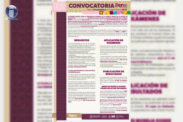 NOTICIAS 18/05/2022CREE del DIF Michoacán abre convocatoria para la licenciatura en Terapia FísicaEl Sistema para el Desarrollo Integral de la Familia (DIF) Michoacán, en coordinación con el Sistema DIF Nacional, abrió la convocatoria para el ciclo escolar 2022-2023 de la licenciatura en Terapia Física, impartida en las instalaciones del Centro de Rehabilitación y Educación Especial, CREE Michoacán.