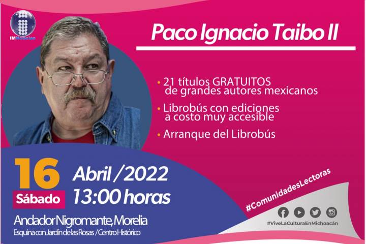 NOTICIAS 16/04/2022Este sábado, Taibo estará en el ClavijeroPaco Ignacio Taibo II recorrerá Michoacán con el objetivo de fomentar la lectura en el estado. Esto en el marco del programa "Haciendo Lectores", que tendrá lugar en 14 municipios de Michoacán del 16 de abril al 6 de mayo. Este programa fue impulsado por la Secretaría de Cultura de Michoacán (Secum), el Fondo de Cultura Económica (FCE) y el Consejo Editorial de la Cámara de Diputados Federal.