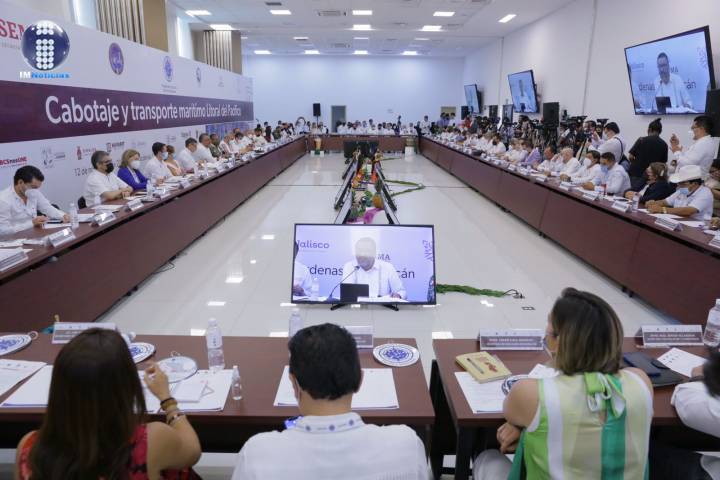 Lázaro Cárdenas, Michoacán, 12 de noviembre del 2021.- El gobernador de Michoacán Alfredo Ramírez Bedolla convocó a las autoridades portuarias y aduanales, así como a gobernadores, a desarrollar rutas de cabotaje en el litoral del Pacífico para potencializar el comercio nacional e internacional, y que México asuma una posición estratégica para el T-MEC.