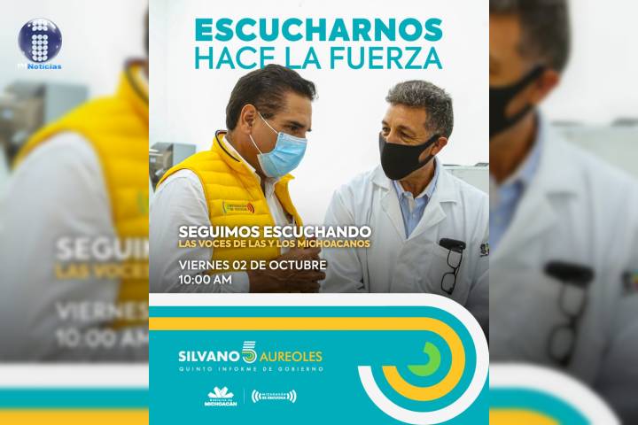 NOTICIAS 01/10/2020Dialogará Gobernador con ciudadanos sobre acciones a 5 años de Gobierno en Michoacán Para que las y los michoacanos sean parte del Quinto Informe de Gobierno del Gobernador, Silvano Aureoles Conejo, este viernes 2 de octubre se transmitirá por diversas plataformas digitales el mensaje, "Escucharnos hace la fuerza".