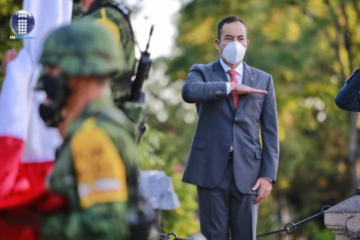 Acompañado de mandos del Ejército Mexicano, el encargado de la polÃtica interna rindió honores a la Bandera de México, cuyo acto se celebró en la Plaza Melchor Ocampo de Morelia.