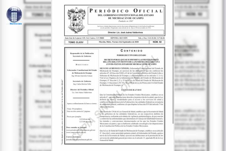 NOTICIAS 07/09/2020Oficializa Gobierno de Michoacán suspensión de fiestas patrias Como una medida necesaria para proteger la salud y la vida de las y los michoacanos, frente a la incidencia de contagios que sigue registrándose a nivel nacional y estatal, el Gobierno que encabeza Silvano Aureoles Conejo, determinó hacer oficial la suspensión de las celebraciones de los festejos patrios del presente año.