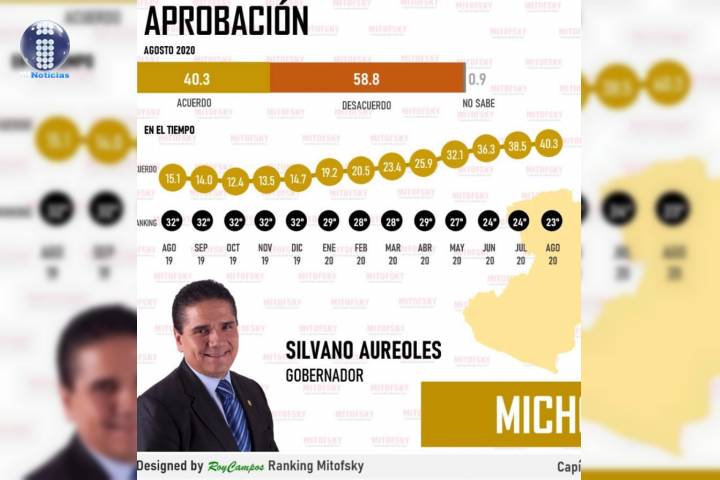 NOTICIAS 09/09/2020Crece aprobación de Silvano Aureoles en encuesta MitofskyEl gobernador de Michoacán, Silvano Aureoles Conejo, alcanzó en el mes de agosto una aprobación del 40.3 por ciento en desempeño, lo que significa un crecimiento de 16.9 puntos en los últimos cinco meses, según la encuestadora Mitofsky.